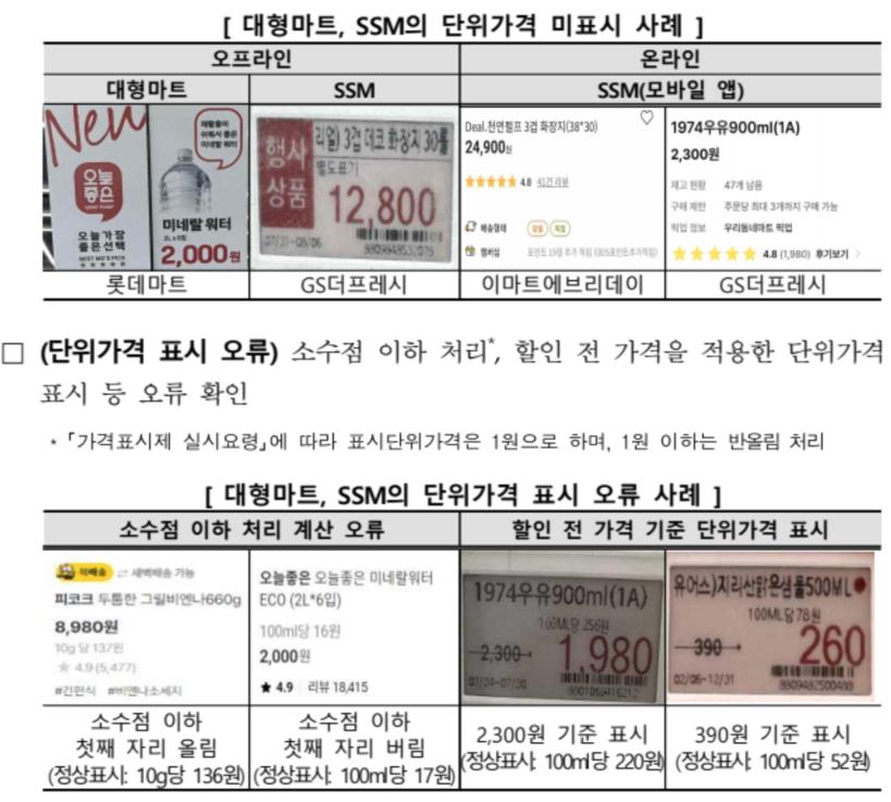 한국소비자원은 “실제 단위가격 표시 의무대상(대형마트, 기업형 슈퍼마켓) 6개 사의 36개 상품 가격표시를 조사한 결과 5개 사업자(이마트, 롯데마트, 홈플러스, GS더프레시, 롯데슈퍼)의 17개 상품에서 단위가격 미표시 및 표시 오류가 확인돼 개선이 필요했다”며 “단위가격 표시 오류가 확인된 총 5개 업체 모두 단위가격 표시 개선 예정임을 회신했다”고 전했다.