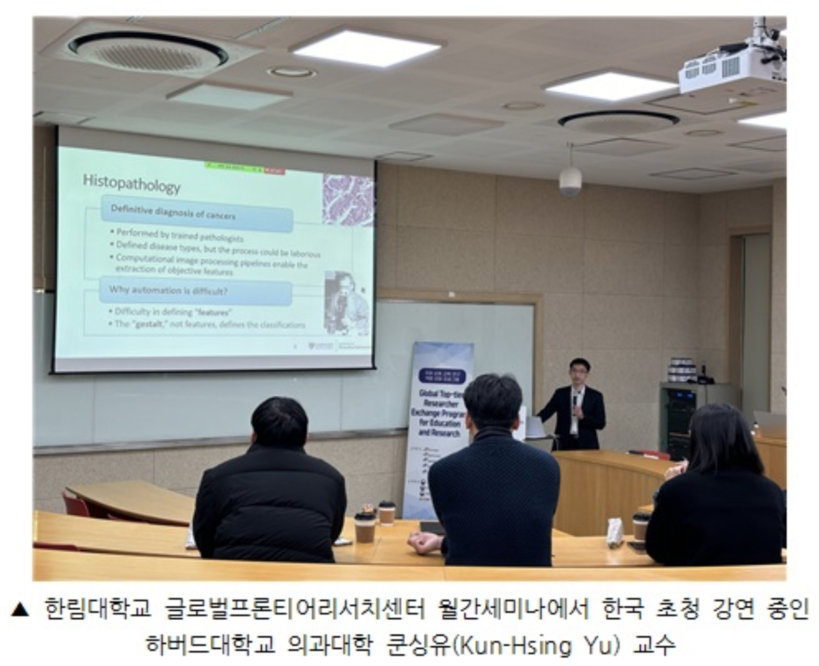 월간세미나는 지난 2월까지 총 6회 개최됐다. 첫 번째 세미나에서는 하버드대학교 의과대학 쿤싱유(Kun-Hsing Yu) 교수가 ‘수백만 개의 샘플을 학습시키는 AI 병리학’에 대한 강연을 펼쳤다. 쿤싱유 교수는 하버드대학교 의생명정보학교실 ‘유랩(The Yu Lab)’을 이끌며 병리학과 인공지능을 결합한 혁신적 모델 개발을 주도하는 디지털 병리학 분야의 세계적인 권위자다. 이 세미나를 통해 한림대학교 인공지능융합학부 연구진은 하버드대학교 의과대학 의생명정보학부 유랩과 후속 공동연구를 논의 중에 있다.