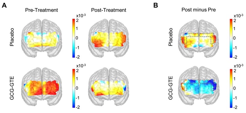 | ▲ 논문에 게재된 시험 수행 전후 뇌의 활성도, 에너지 소비 변화.(사진=아모레퍼시픽 제공) |