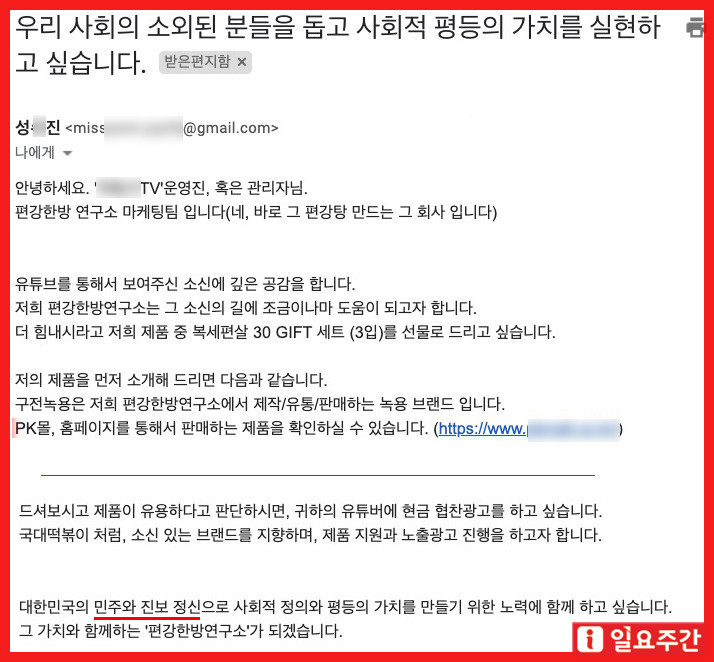▲ 편강한방연구소가 진보 유튜버를 돕고 싶다며 보낸 이메일 (이미지편집=일요주간) |
