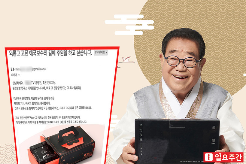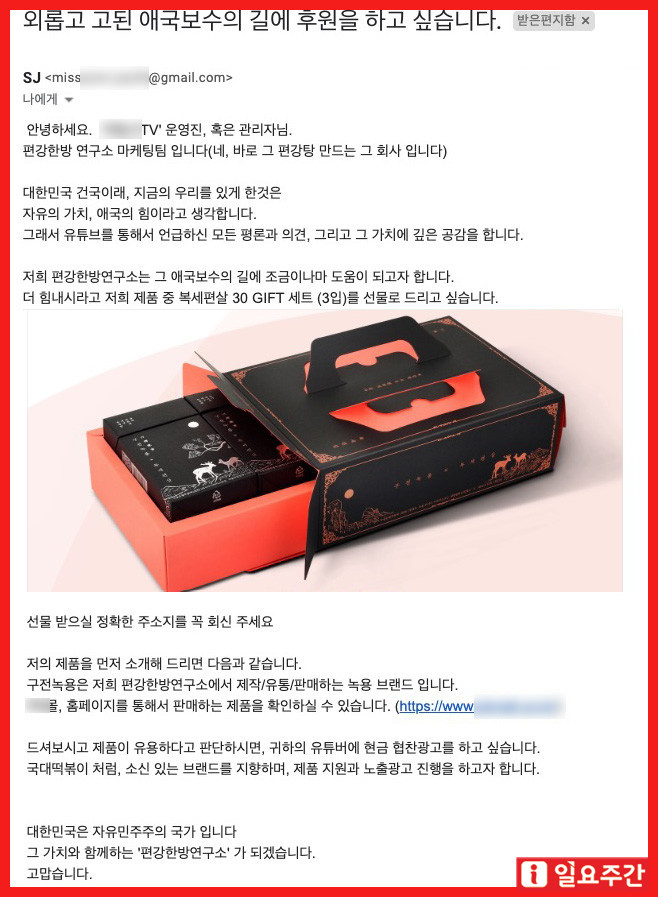 6만여 구독자를 확보한 유튜버 A씨는 편강한방연구소 마케팅팀 B씨에게 이같은 내용의 이메일을 3차례에 걸쳐 받았다며 일요주간에 제보해 왔다. 제목은 "외롭고 고된 애국보수의 길에 후원을 하고 싶습니다"라는 내용으로 자사의 제품 한세트를 증정하고 싶다는 내용이다.