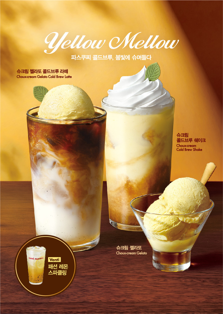 특히 봄빛을 연상케하는 화사한 노란 색감과 음료 위에 얹어진 꽃잎 초코픽은 봄의 싱그러운 분위기를 한층 더했다. 또한 슈크림 신제품 외에 봄에 청량하게 즐기기 좋은 ▲달달한 패션후르츠와 상큼한 시칠리아 레몬으로 만든 ‘패션 레몬 스파클링’도 출시했다.