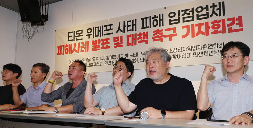 ▲ 한국중소상인자영업자총연합회 등이 29일 서울 종로구 참여연대에서 열린 티몬 위메프 사태 피해 입점업체 피해사례 발표 및 대책 촉구 기자회견에서 구호를 외치고 있다. (사진=newsis) |