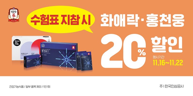 정관장은 수험생과 함께 고생한 부모님을 위한 프로모션도 진행한다. 이달 16일부터 22일까지단 7일 간 정관장 가맹점 및 직영점에 방문해 수험표를 제시하면 부모님 건강을 위한 ‘화애락’ 및 ‘홍천웅’에 할인 혜택이 적용된다.