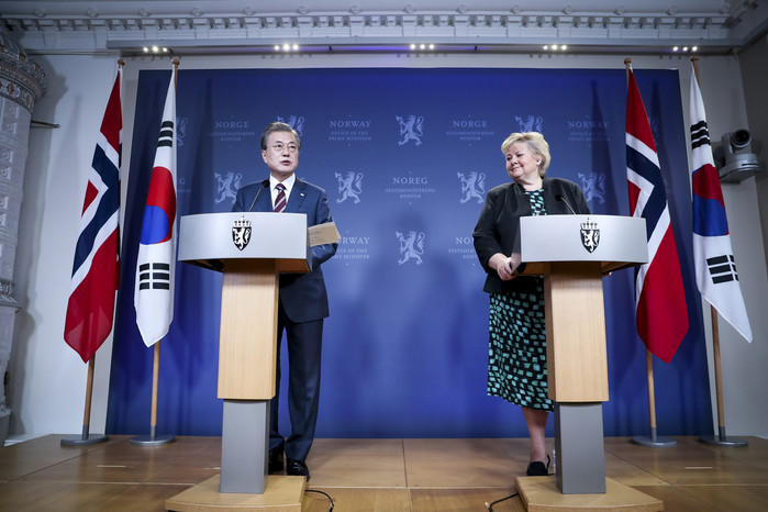 | ▲ 노르웨이를 국빈 방문 중인 문재인 대통령이 13일 오슬로 총리관저에서 에르나 솔베르그 총리와 공동기자회견을 하고 있는 모습.(사진=newsis) |