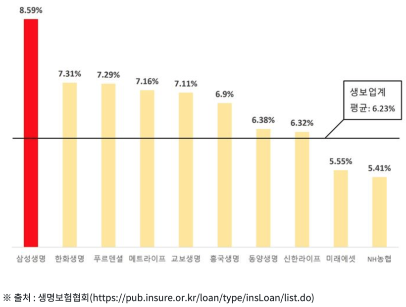 [일요주간 = 김완재 기자] 업계 1위 삼성생명은 보험계약대출(가입자가 해지환급금 범위 내에서 보험사에게 대출을 받는 것) 금리가 타 보험사 대비 아주 높은 것으로 나타났다.