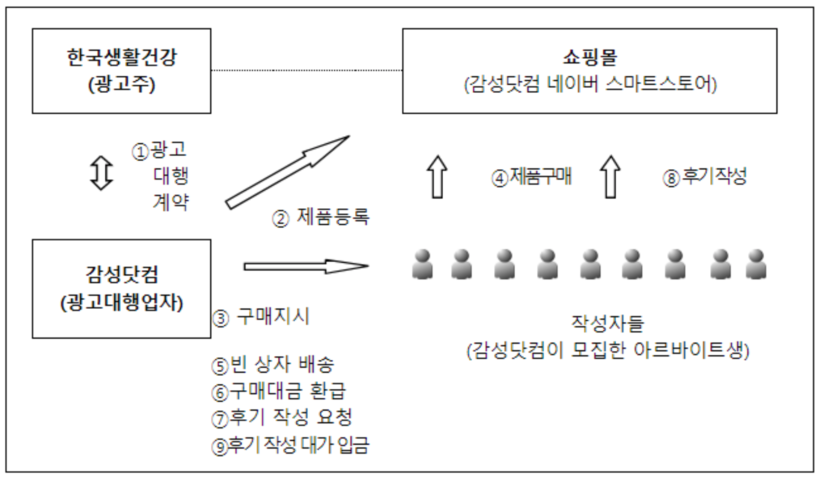 한국생활건강이 특정 제품의 허위 구매후기 작성을 의뢰하면 감성닷컴이 제품 등록, 아르바이트생 모집, 빈 상자 배송, 구매대금 환급 등의 업무를 직접 수행한 것으로 드러났다.