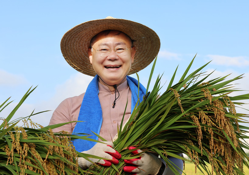 | ▲ 올해 첫 수확 벼 들고 활짝 웃는 김재욱 칠곡군수. (사진=칠곡군 제공) |