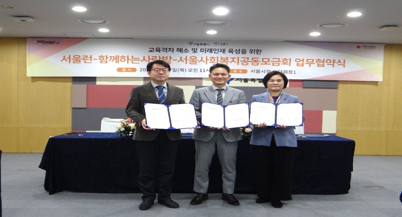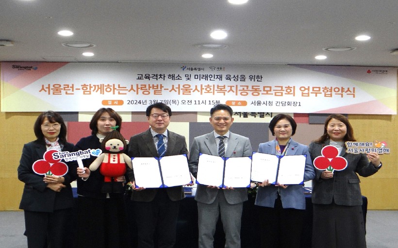 서울시는 7일(목) 오전 11시 15분에 사단법인 함께하는사랑밭(이하 사랑밭), 서울사회복지공동모금회(이하 서울사랑의열매)와 3자 간 「교육격차 해소 및 미래 인재 육성을 위한 업무협약」을 체결했다.