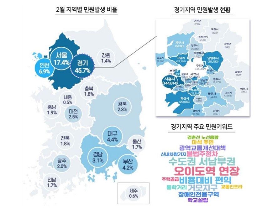 전월보다 민원이 가장 많이 증가한 지역은 경기 지역으로 35.6% 늘었다. 경기 지역 중에서는 시흥시에서 가장 많은 민원(14만 4814건)이 접수됐다.
