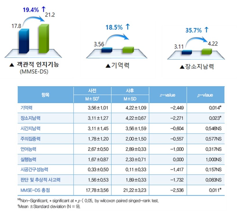 대상자가 주관적으로 느끼는 기억장애문제(SMCQ)는 40.3% 줄었고, 우울감(SGDS-K)은 68.3% 줄어 정상 범위로 회복됐다.