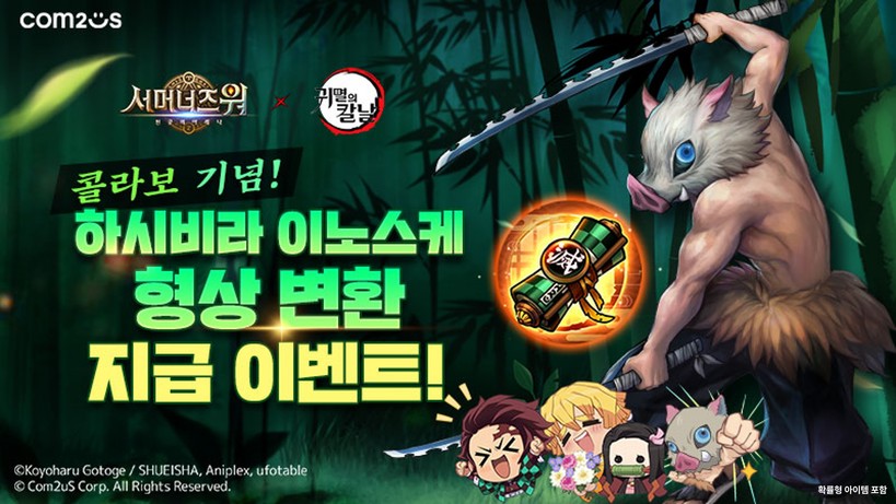 컴투스는 애니메이션 ‘귀멸의 칼날’과의 컬래버를 기념해 형상 변환 지급 이벤트를 실시했다고 11일 밝혔다.