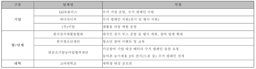 대중소기업농어업협력재단은 농어촌지역에 방치되고 있는 드론 배터리와 부표 배터리 등에 대한 수거 홍보물을 지자체 등에 전달하고 수거 작업이 원활히 이뤄지도록 할 계획이다. 한국청소년재단은 더 많은 아동과 청소년이 캠페인에 참여하도록 독려할 계획이다. 고려대학교는 지역사회 연계 캠페인과 대학생 동영상 공모전을 개최하고 타 대학에도 캠페인 참여를 독려할 계획이다.