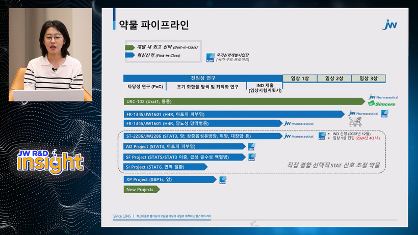 지난 달 30일 공개된 콘텐츠에서는 JW중외제약 신약연구센터와 함께 JW의 혁신신약 개발에 주요 역할을 맡고 있는 C&C신약연구소를 집중 조명했다. C&C신약연구소의 연구기획팀장이 출연해 AI 기반 자체 R&D 플랫폼, 국가신약개발사업 지원 과제, STAT3 표적항암제 JW2286의 전임상 결과 등을 설명했다.