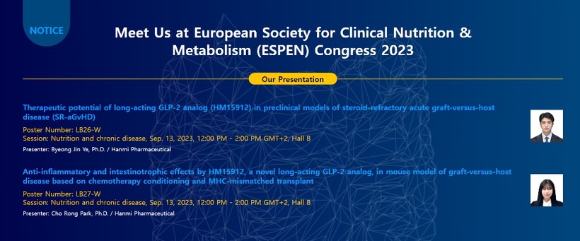 프랑스 리옹에서 11일부터 14일까지 열린 '유럽임상영양대사학회(ESPEN Congress 2023)'에서 한미약품은 단장증후군 치료제 'LAPSGLP-2 analog(HM15912)'의 연구 결과를 발표했다. 해당 발표에서는 HM15912가 소장 성장을 촉진하고 장 염증을 완화시키는 효능을 바탕으로 이식편대숙주병에 대한 새로운 치료 전략을 제시했다.