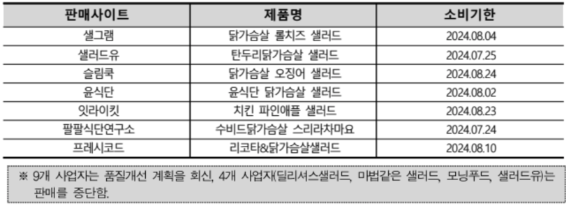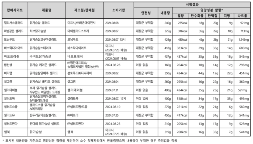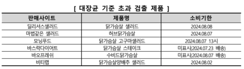 ◇ 닭가슴살 샐러드 13개 제품, 대장균 기준 초과해 위생관리 미흡