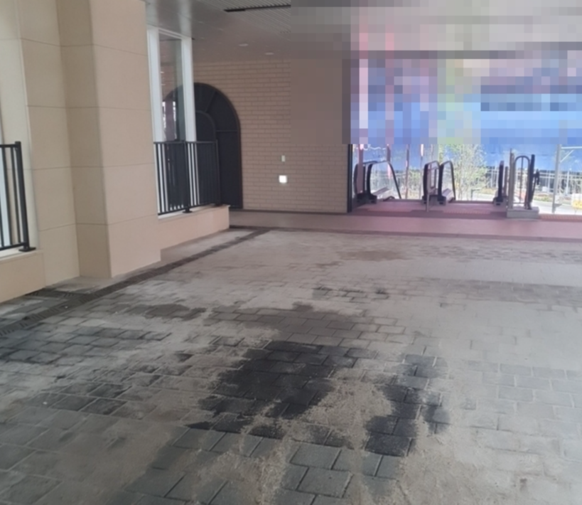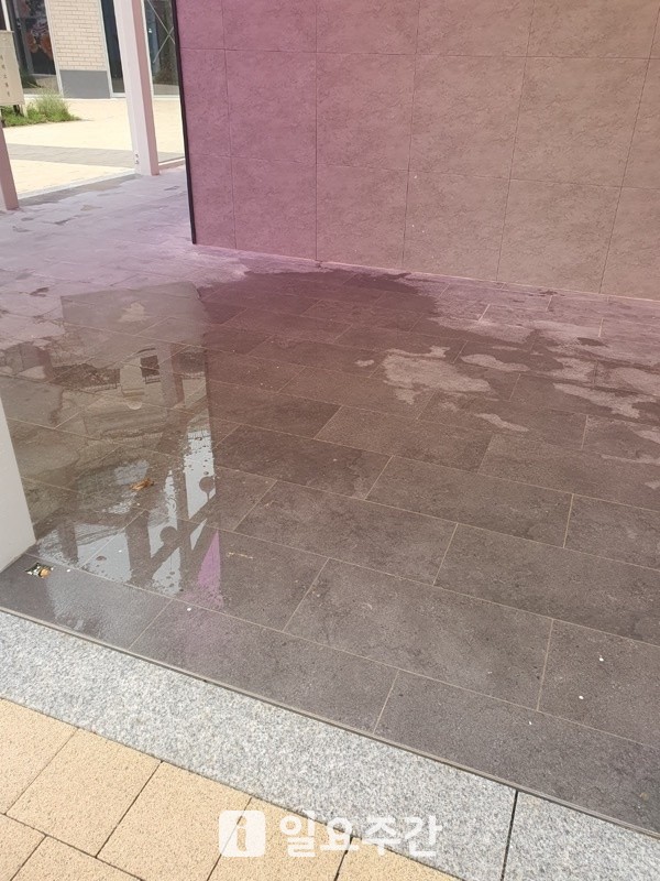 ▲비 온 뒤 야외 조경 공간 침수 상황. (사진=제보자 A 씨 제공) |
