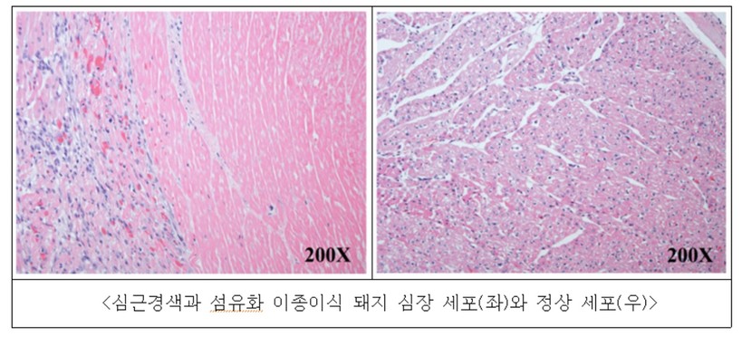 10일 농진청에 따르면 연구진은 이종이식(종이 다른 동물의 기관·조직 이식) 이후 거부반응을 일으킨 돼지 심장에서 병리학적으로는 혈관성 거부반응, 심근경색과 심장 섬유화가 진행됐다.