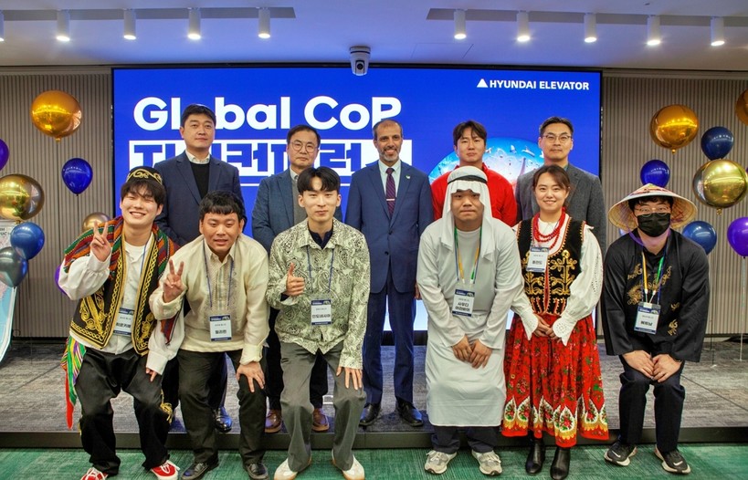 | ▲ 현대엘리베이터가 25일 현대그룹빌딩(서울시 종로구) 1층 H-스타디움에서 사내 자율학습 조직인 ‘글로벌 Cop(Community of Practice)’의 연구 활동을 임직원과 공유하는 지식 컨퍼런스를 개최했다. 이번 컨퍼런스에는 ‘네옴 시티’ 프로젝트를 추진 중인 사우디아라비아의 압둘아지즈 알다엘 주한 문화원장(뒷줄 오른쪽에서 세번째)이 참석해 조재천 대표이사(뒷줄 왼쪽에서 두번째)와 기술 인력 교류 등에 대해 논의하고 “우리는 언제든 어떤 방식이든 현대엘리베이터와 협력할 준비가 되어 있다”고 말했다.(사진=현대그룹 제공) |