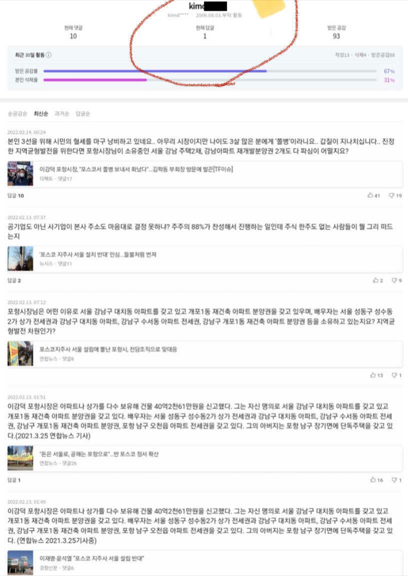 그러면서 "지주사 서울 설치를 반대하는 포항시장 및 대선주자들 관련 기사에 달린 댓글들도 모두 지워지고 없다”고 덧붙였다.