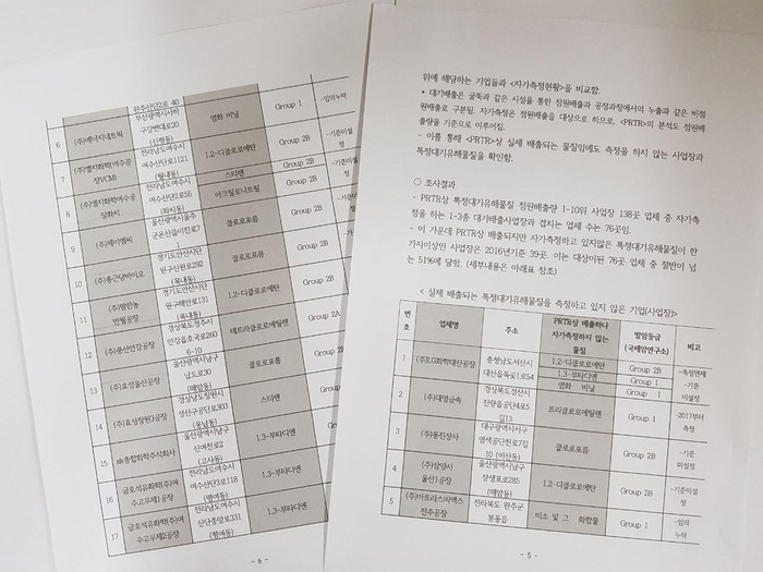 이를 위해 각 사업장에서 실제 대기로 배출하는 특정대기유해물질의 종류를 파악하기 위해 환경부 산하 화학물질안전관리원에서 관리하는 '2016년 화학물질 배출이동량 정보시스템'상의 발암물질 대기배출 통계가 사용됐으며 아울러 각 사업장이 대기배출시설에서 측정하는 특정대기유해물질의 항목을 파악하기 위해 환경부가 작성한 '2016년 1-3종 대기배출사업장 자가측정현황' 자료를 사용했다는 게 이정미 의원 측 설명이다.