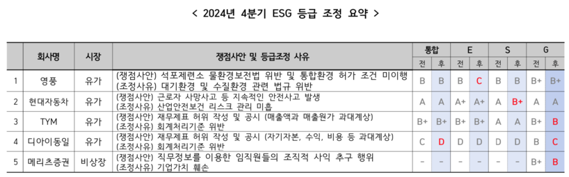 KCGS에 따르면 지난해 10월 17일부터 12월 31일 기간에 확인된 ESG 위험을 반영해 평가대상 기업에 대한 2024년 4분기 등급 조정을 실시했다. ESG 등급(개별 등급 및 통합 등급)은 S, A+, A, B+, B, C, D 7등급으로 구분된다.