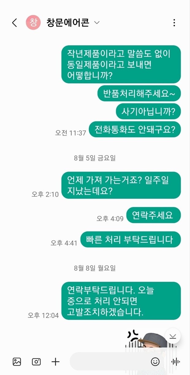 ▲ 소비자 A 씨는 구매한 창문향 에어컨이 신상이 아닌 작년 생산된 구 모델이라는 사실을 뒤늦게 확인하고 KT와 판매사(뉴퍼마켓 입점사)에 컴플레인을 제기했지만 책임을 떠넘기거나 전화를 받지 않는 등 무대응으로 일관했다.(사진=제보자) |
