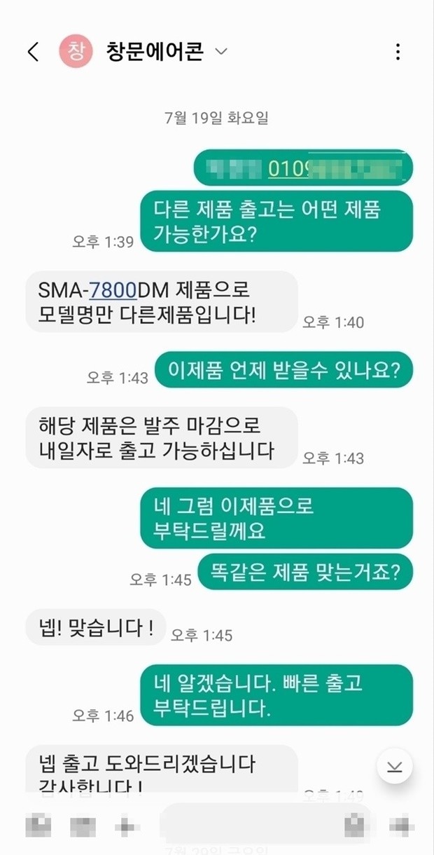 KT 가입자인 소비자 A 씨는 지난 7월 16일, KT에서 발송한 'K-Deal'을 보고 창문형 에어컨(모델명 : SMA-C7000DM)을 주문했는데, 다음날인 17일, 해당 제품을 판매한 업체에서 A 씨에게 문자를 보내 주문한 제품의 공급이 딸린다면서 동일한 성능의 다른 모텔(SMA-7800DM)을 보내주겠다고 했다.