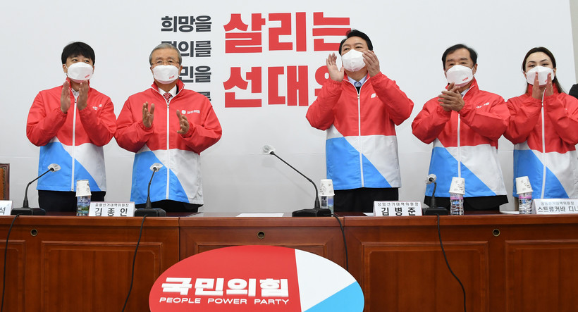 윤석열 대선 후보, 김종인 총괄선대위원장, 김병준 상임선대위원장, 이준석 상임선대위원장 등은 이날 오전 국회 본관에서 열린 국민의힘 중앙선대위 제막식에 참여했다.