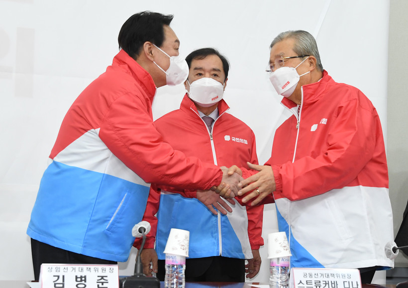 | ▲ 윤석열 국민의힘 대선 후보와 김종인 총괄선대위원장이 7일 서울 여의도 국회에서 열린 중앙선거대책위원회 제1차 회의에서 악수하고 있다. (사진=뉴시스/공동취재사진) |