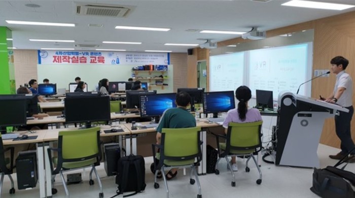 | ▲국립 경상대학교 LINC+ 사업단 인재양성센터는 창업지원단과 공동으로 21~22일 양일 간 4IR 혁신 강의실에서 ‘4차 산업혁명 VR 콘텐츠 제작 실습 프로그램’을 진행했다.(사진=경상대학교 제공) |
