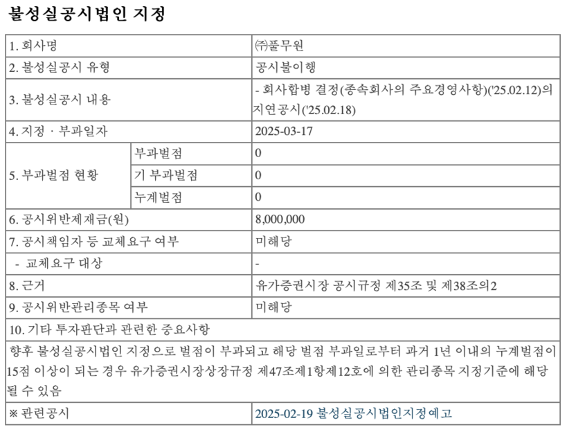 ◇ 불성실공시법인 지정, 제재금 800만 원 부과됐고 브랜드 이미지 타격 예상