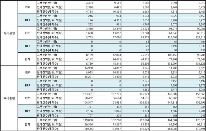 한편 제윤경 더불어민주당 의원이 26일 공개한 금융감독원으로부터 제출 받은 최근 5년 간 16개 시중은행의 증권형 파생상품 판매 현황 자료에 따르면 주가연계특정금전신탁(ELT)ㆍ파생결합증권신탁(DLT)ㆍ주가연계펀드(ELF)ㆍ파생결합증권펀드(DLF)의 판매 잔액은 2015년 30조원대에서 올해(8월 7일까지) 49조 8000억원대로 꾸준히 증가했다. 같은 기간 가입 건수 역시 66만 8000여건에서 100만건으로 큰 폭으로 증가한 것으로 나타났다.