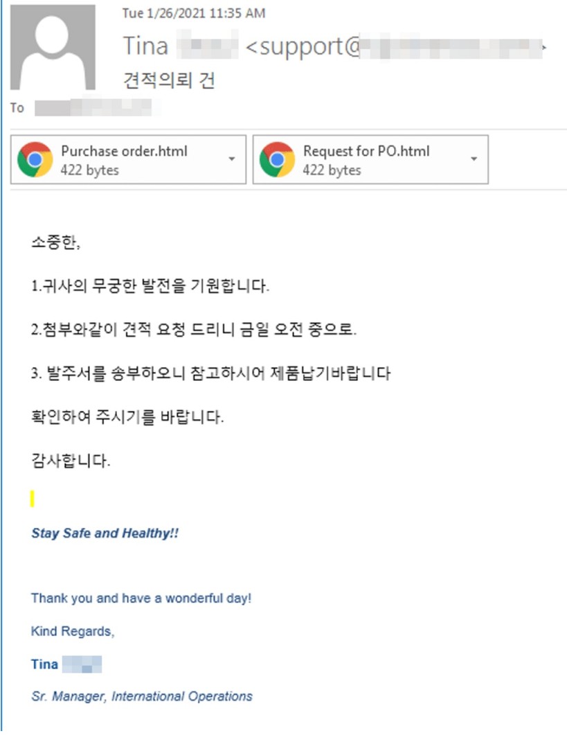 공격자는 해당 메일에 ‘Purchase order.html’ 및 ‘Request for PO.html’이라는 2개의 악성 HTML 파일을 첨부했다.