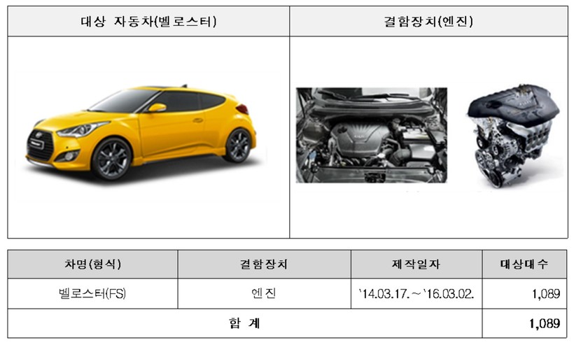 1일 국토교통부에 따르면 현대자동차서 제작·판매한 벨로스터 1089대는 엔진 내부의 일부 부품 마모 등 손상으로 주행 중 시동이 꺼지거나 화재가 발생할 가능성이 확인됐다.