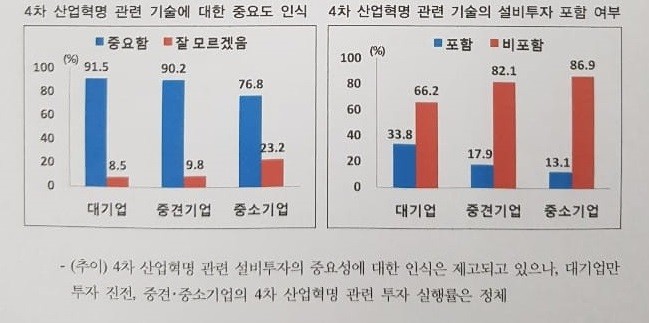 KDB산업은행에 따르면 4차 산업기술이 사업영위에 중요하다고 응답한 비중은 83.0%로 대기업의 91.5%, 중견기업 90.2%가 중요성을 인식하고 있으나 중소기업은 76.8%가 중요하다고 응답, 상대적으로 적은 비중으로 인식되고 있는 것으로 드러났다.