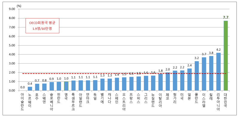 또한, 2020년 기준 고령 인구 10만 명당 보행 중 교통사고 사망자 수는 7.7명으로 OECD 회원국 중 가장 많은 것으로 나타났다.