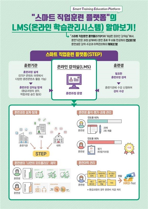 [일요주간=하수은 기자] 고용노동부와 한국기술교육대학교는 올해 10월 개통 예정인 ‘스마트 직업훈련 플랫폼(STEP)’을 활용할 훈련기관을 선발해 온라인 학습관리시스템(LMS)을 보급한다고 5일 밝혔다.