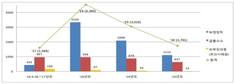 권익위는 “청탁금지법 위반신고 처리 과정에서 과태료 부과를 누락하는 등 일부 조치가 미흡한 사례에 대해 시정을 요구하고 이행 여부를 부패방지 시책평가 지표로 반영해 엄정히 관리해 나갈 것”이라고 전했다.