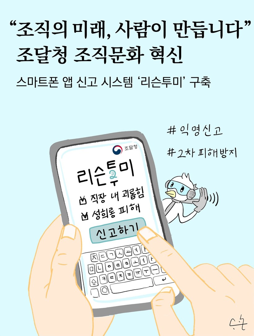 김정우 조달청장은 “리슨투미 도입은 직장 내 괴롭힘·성희롱 예방을 위한 선제 조치”라며 “앞으로도 따뜻한 조직으로 거듭나기 위한 조직문화 개선에 노력하겠다”고 말했다.