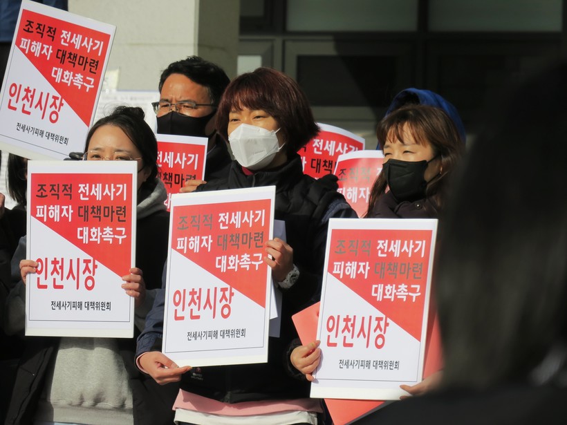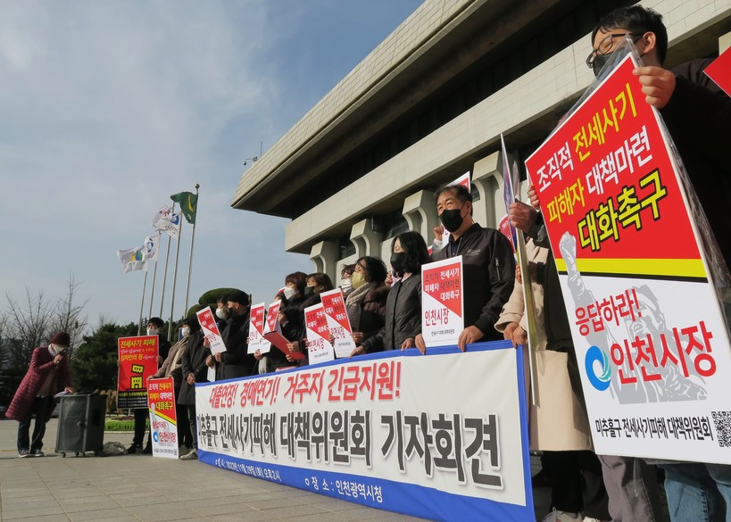 | ▲지난 11월 29일 인천 남동구 인천시청 앞에서 미추홀구 전세사기 피해 대책위원회가 기자회견을 열고 전세사기 피해 지원 대책 마련을 요구하고 있다.(사진=newsis) |