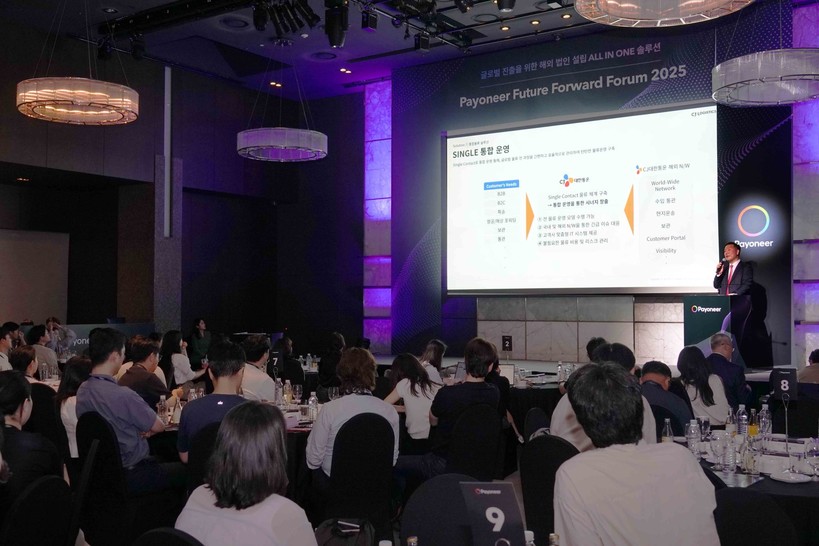 지난 16일 서울 중구 더플라자호텔에서 열린 ‘페이오니아 퓨처 포워드 포럼 2025’에 참여한 CJ대한통운은 글로벌 물류 관리 전략과 국내·국제 물류 서비스를 소개했다. 이 자리에는 글로벌 토탈 금융 솔루션 기업 페이오니아(Payoneer)가 해외 판매 대금 수취 및 결제 최적화 방안을, 글로벌 전자상거래 플랫폼 쇼피파이(Shopify)가 자사몰 개설·운영 방안을 함께 선보였다.