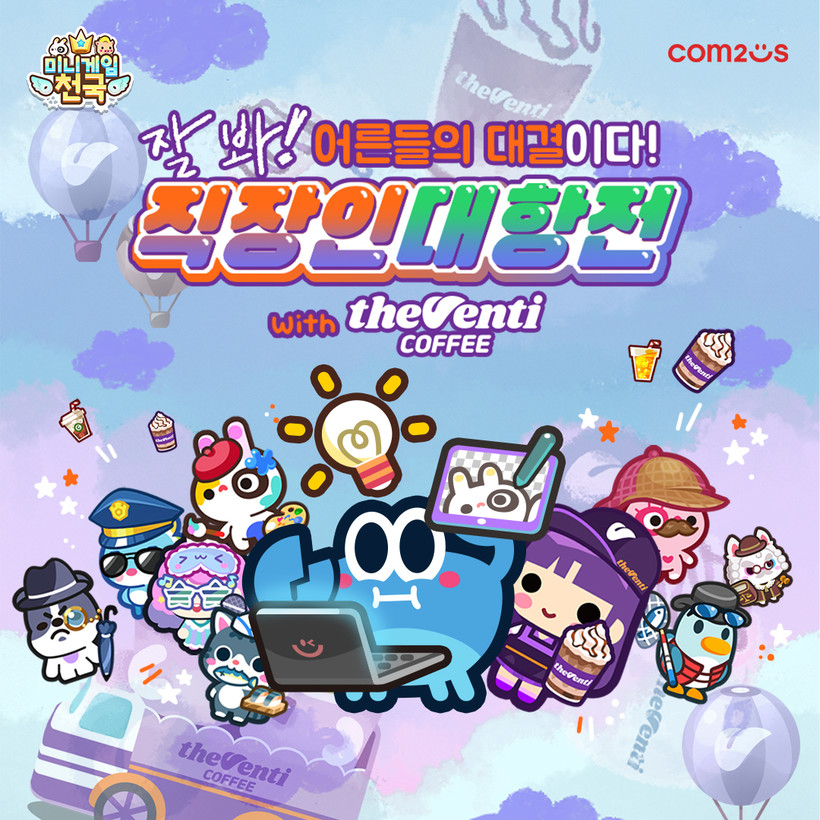 [일요주간 = 이수근 기자] 컴투스(대표 이주환)는 커피 프랜차이즈 ‘더벤티’와 협업해 캐주얼 게임 ‘미니게임천국’에서 직장인 대항전을 비롯해 다양한 ‘더벤티’ 컬래버레이션 이벤트를 실시한다.