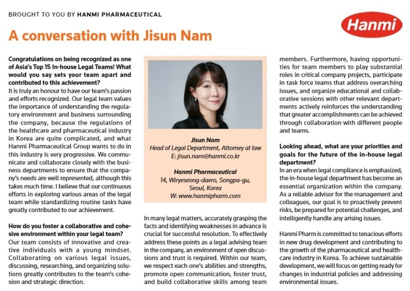 한미 법무팀장 남지선은 “법무팀은 헬스케어 분야에서의 기업 법무 전문성 강화를 위해 다양한 프로젝트에 중요한 위치에서 활동하고 있다”며 “한미그룹의 준법경영을 지키는 동시에, 신뢰받는 법률 자문자로서의 역할을 충실히 수행하고 있다”고 전했다.