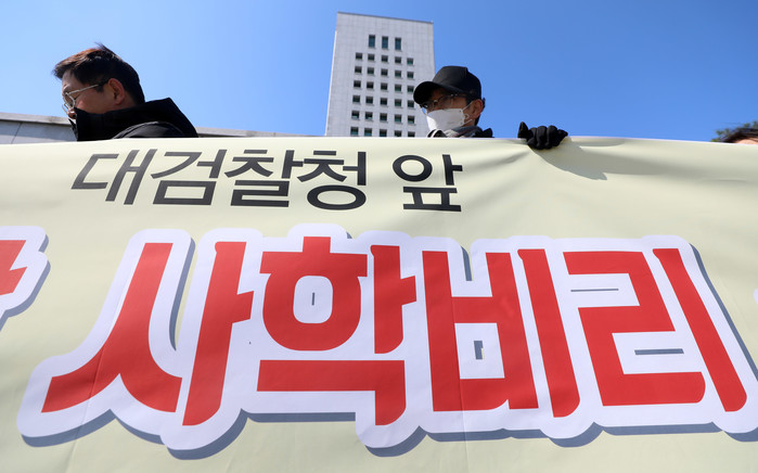 | ▲ 전국교권수호교수모임과 공익제보자모임이 지난 3월 22일 서울 서초구 대검찰청 앞에서 기자회견을 열고 두원공과대학교 국비 횡령 고발사건에 대한 수사를 촉구하고 있는 모습. |