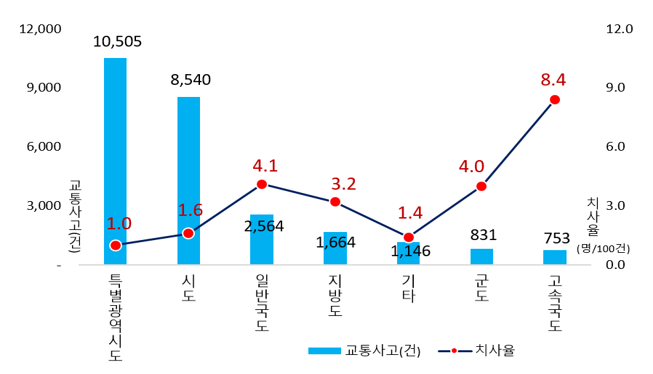 도로별로는 특별광역시 도로(40%, 10,505건)와 시 도로(33%, 8,540건)에서 주로 발생하였고, 이 중 고속국도(3%, 753건)의 사고 건수는 적었지만 치사율*은 가장 높게 나타나고 있어 매우 위험하다. * 치사율(명/100건)=사망자수×100/사고건수(사고 100건당 사망자수)