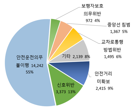 이러한 빗길 교통사고의 절반 이상은 운전 중 휴대전화 사용이나 동영상 시청 등의 안전운전의무 불이행(55%, 14,242건)이며, 그 외에도 신호위반 13%(3,373건), 안전거리 미확보 9%(2,415건) 등의 법규위반으로 발생한다.