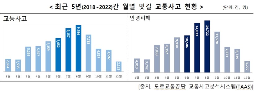 | ▲ 최근 5년(2018~2022)간 월별 빗길 교통사고 현황(이미지=도로교통공단) |