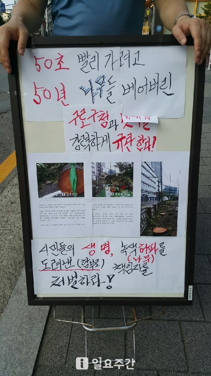 서울 구로구에 거주하는 주민 이 모 씨가 구로구청이 도로확장을 명목으로 50여 년생의 나무 수십여 그루를 베어낸 것에 대해 분개해 지난 5일부터 1인 시위에 돌입하며 이 같이 밝혔다.