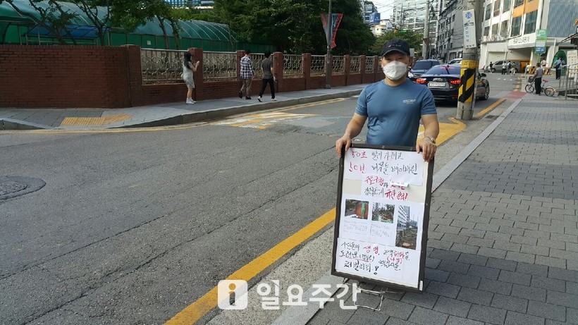 ▲구로구청이 도로확장을 명목으로 나무 수십여 그루를 무차별적으로 벌목한 것에 분개해 구로구 주민 이 모 씨가 1인 시위에 나섰다.(사진=김상영 기자) |